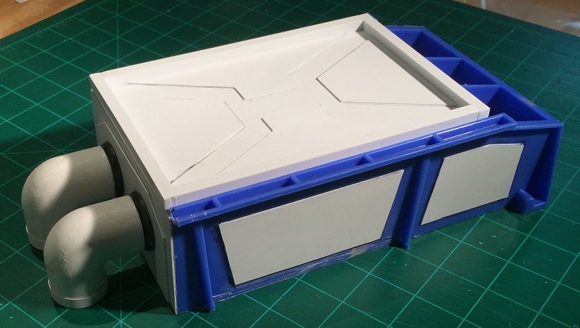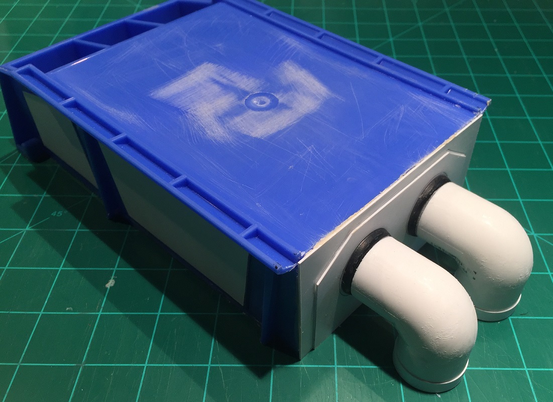 Center the elbows on the rear of the bunker with the 30mm base touching the rear wall. Take care to place your bunker on a level surface and ensure the elbows touch the ground and are level. You can use the second template in the template file to help you space and center the pipes. Test fit and sanity check before gluing!