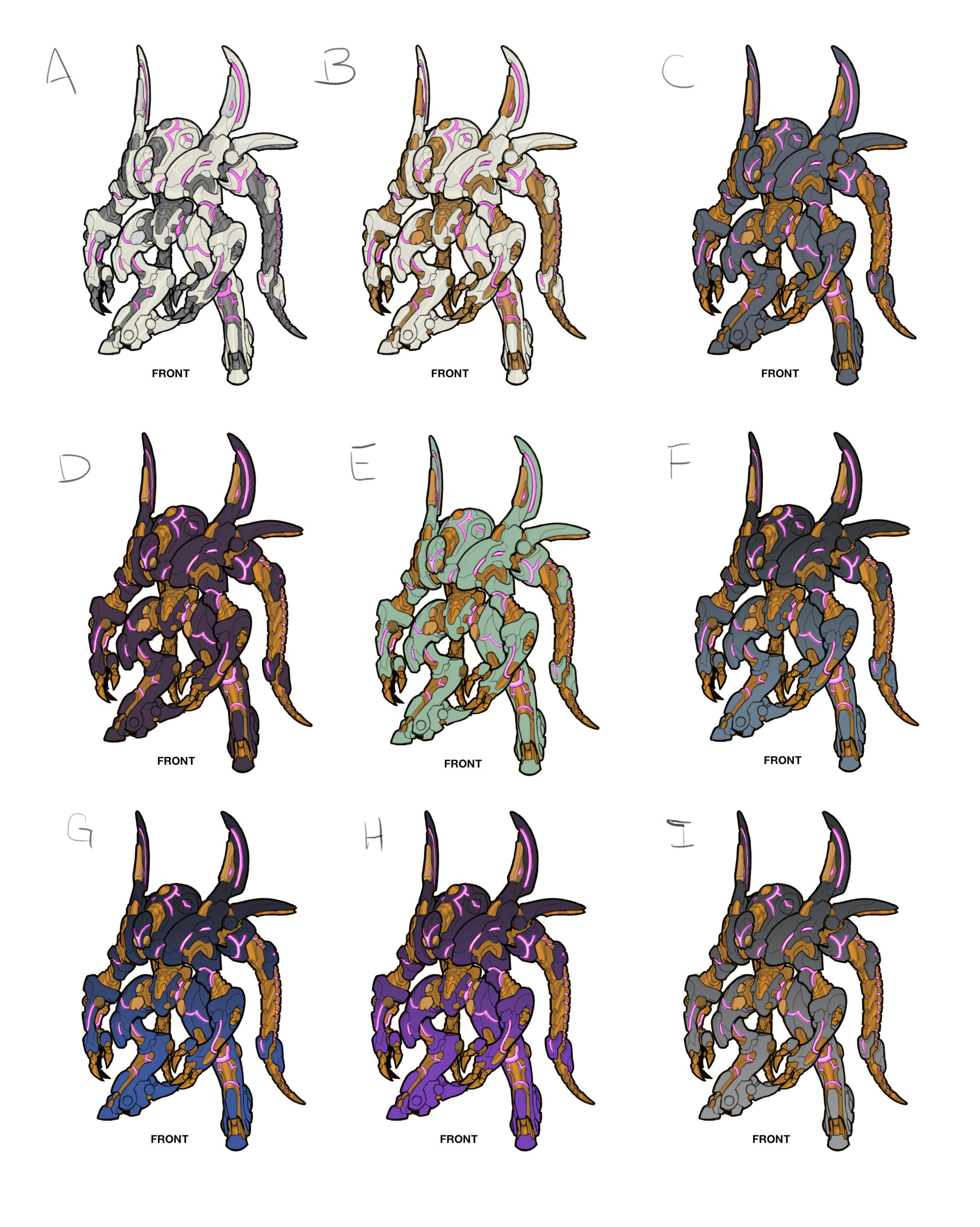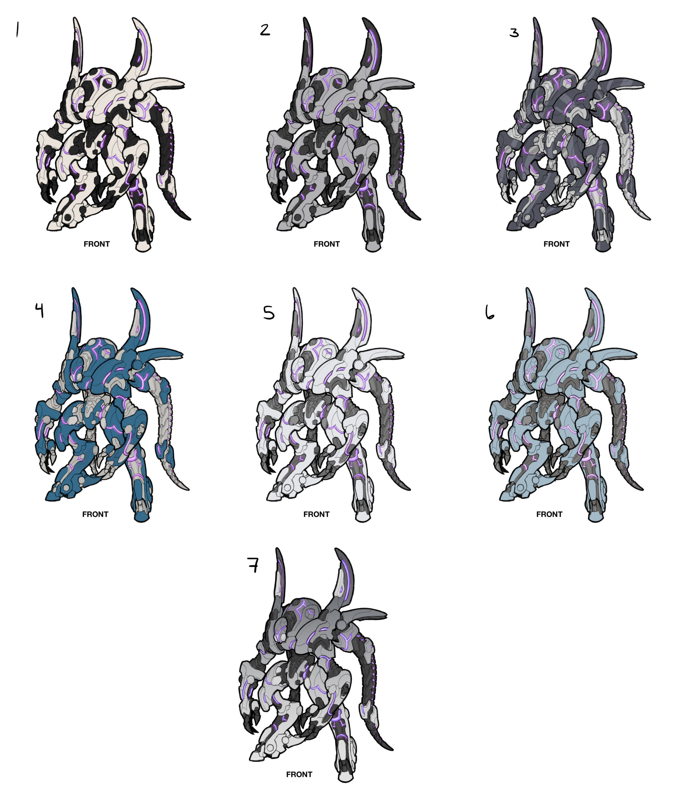 In this round, the focus was on various options for gray and white and even a little blue experimentation. The warmer, almost eggshell white armor of number one, as well as the purple glow, was a winner as was the medium grey steel in number five.