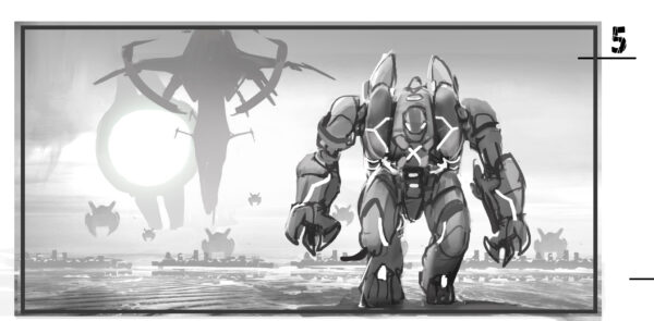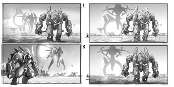 Sketches 1–3 were worked up by Vincent, and #4 was my mashup of 1 and 2. The only added note was that we would need to see the light vehicle in the sky. With that, Vincent worked up sketch #5.