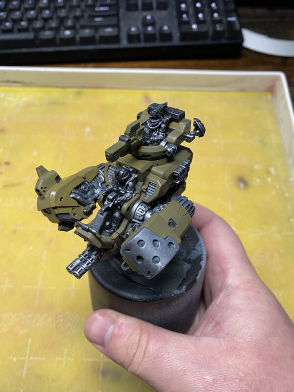 This is where we start highlighting, trying to define the edges of the armor plating. I used a mixture of Bile Thrall and Menoth White Highlight to achieve this first highlight layer.