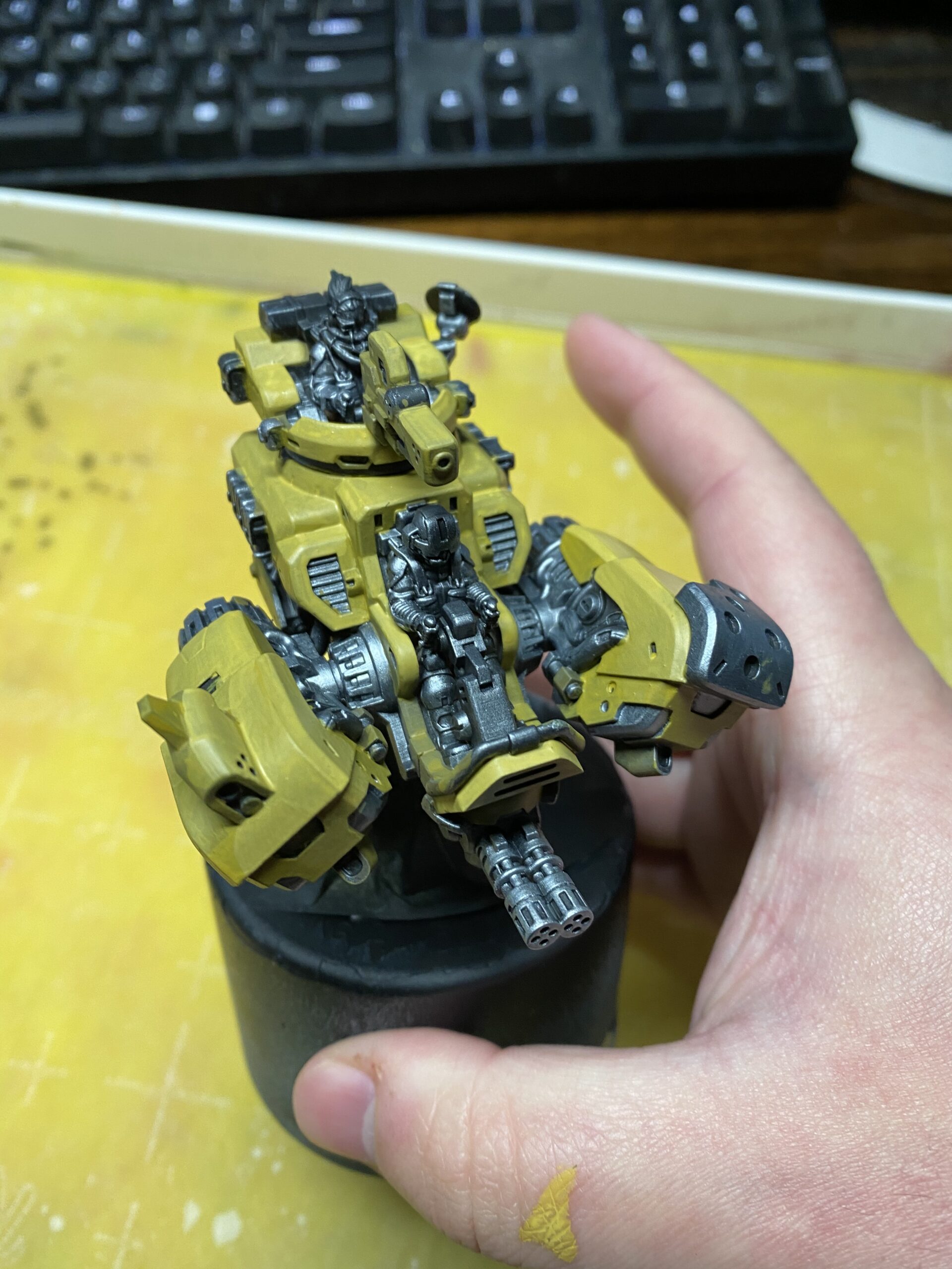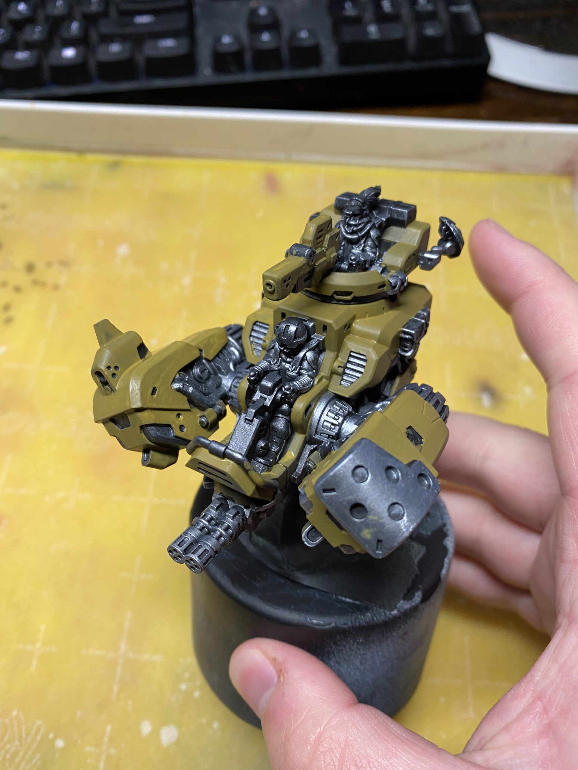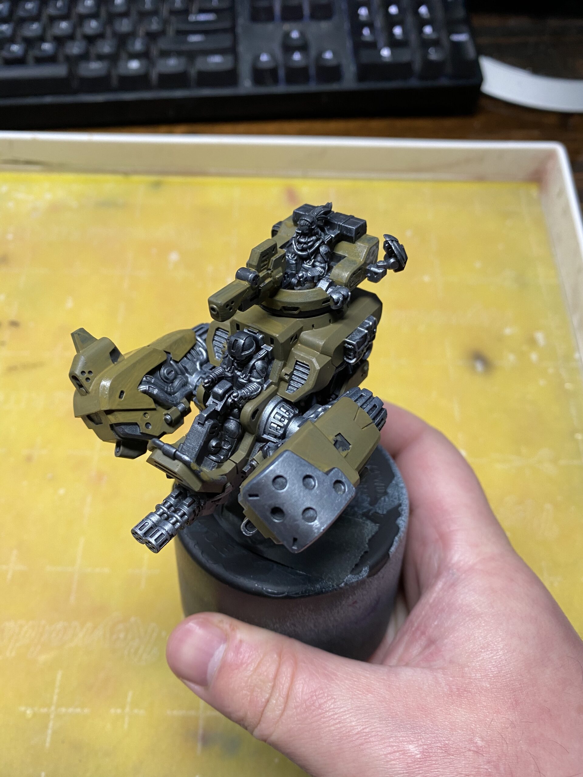 You can see here that I’ve manually painted on a few layers of Thornwood Green on all the parts of the model that will eventually be ochre. I use colors with similar undertones to the main color so that it will have better coverage and take less coats of paint.