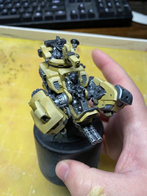There are a couple ways to approach painting this armor. One would be to mask off the parts that will not be ochre and airbrush the layers of color over the unmasked portion. Unfortunately, I don’t have an airbrush set up at the moment (as I am working from my home office), so I had to go with option 2, which is to build up layers of color starting with the shade colors to build a strong opacity with as few coats as possible.