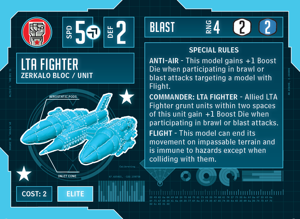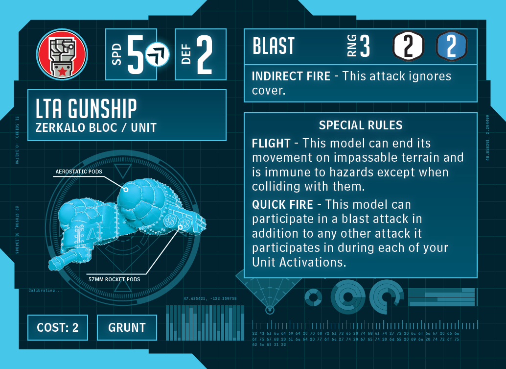 For the airborne specialist, I wanted a counterpart to real-world helicopters. The LTA Gunship is bristling with weapons and, with rules like Indirect Fire and Quick Fire, it will take care of any ground target the fighters can’t handle.