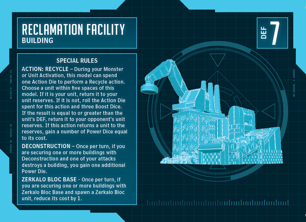 To wrap up this Insider, let’s take a look at the Zerkalo Bloc base. This was the one place in the Faction where I wanted to diverge a bit from the military theme and lean into the practicality I saw in the Faction. Being as far from home as they are, I imagined they would try to establish bases to get the most out of the territory they had conquered. I also wanted to do something we hadn’t touched on in Monsterpocalypse yet, so I gave them a Reclamation Facility. We have a building that gives you extra Power Dice for destroying enemy units but not one for smashing buildings…until now. Deconstruction means you’ll always get a bit more out of attacks against buildings and forces with rules like Demolisher. After adding that much needed utility power, I also wanted to get a little aggressive with the building. The Rocket Gantry was the first building with a pseudo-attack. This building has a much more direct “attack-like” rule. The Recycle action lets you turn units into Power Dice, and if you want to use it against an enemy unit, you roll dice to see if the unit will hold still so the big magnet can grab it.