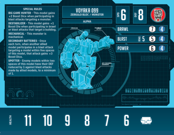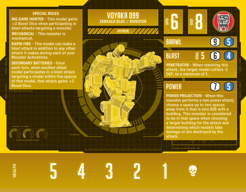 For the hyper side of its card, I wanted to pump up the guns a little more and let Voyaka do something interesting with the city. Penetrator on the blast and Rapid Fire allow it to threaten monsters even more with Big Game Hunter but also challenge plenty of other targets. Power Projection is a small touch to the power level of the monster, but it gives it an interesting option for clearing a path through bothersome buildings while also getting some damage in on enemy models. The ability to perform a ram power attack against a building without having to be in the standard position for that attack is a fun tool in Voyaka’s kit that I’m excited to see in the wild.