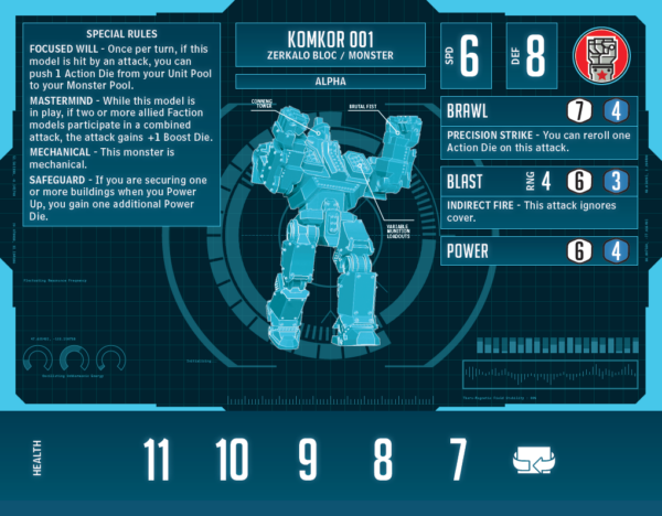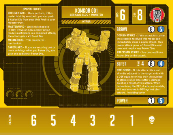 Komkor 001 is piloted by a veteran of dozens of campaigns conquering parallel Earths, but the monster’s true purpose is to shepherd a command staff deep into enemy territory. The first ability I put on this model was Safeguard. As I noted earlier, I had started this Faction’s development with the idea of evil G.U.A.R.D., and that ability has always seemed core to that Faction. I love the idea that the “good guys” aren’t the only ones who see the value of capturing territory intact, and with that rule, I saw a theme. This monster interacts with every kind of die in Monsterpocalypse. It gets you extra Power Dice with Safeguard, extra Boost Dice with Mastermind, and extra Action Dice with Focused Will. A couple of small bonus abilities on its attacks were all it needed after that.