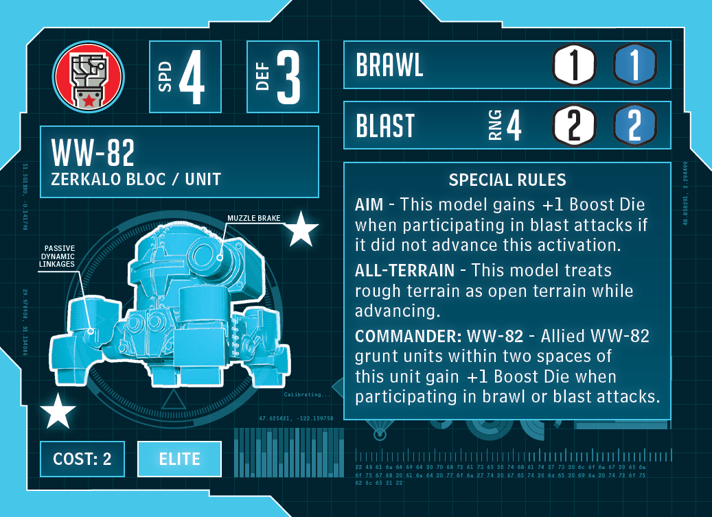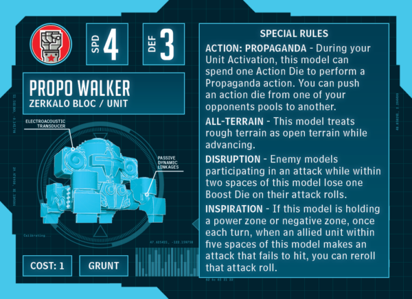 The specialist in their blister is probably my favorite thing in the Faction. Whether you need patriotic music to inspire your own troops or propaganda messages to discourage your opponents, the Propo Walker has you covered. Despite the fact that it isn’t armed with a weapon, its presence is always obvious on the battlefield. It has a few rules that have been seen before, but Inspiration is brand new. If one of these little tin cans is on a power zone or negative zone, you gain a reroll for one unit attack within five spaces of it.