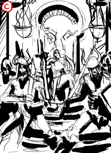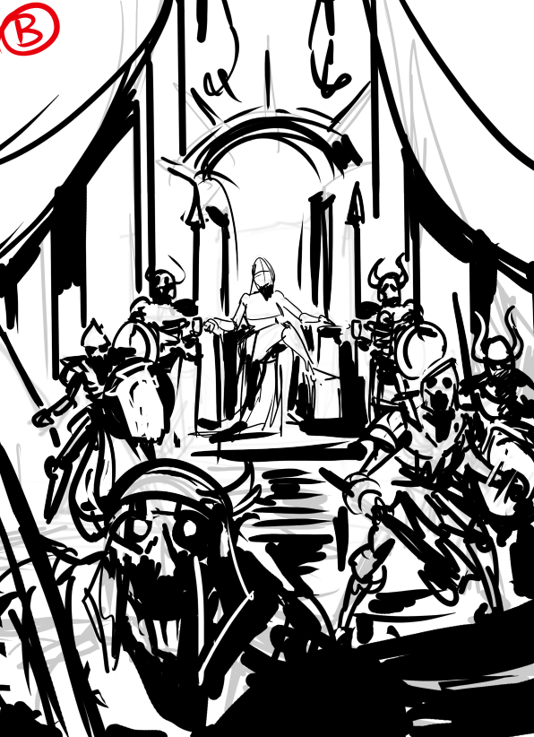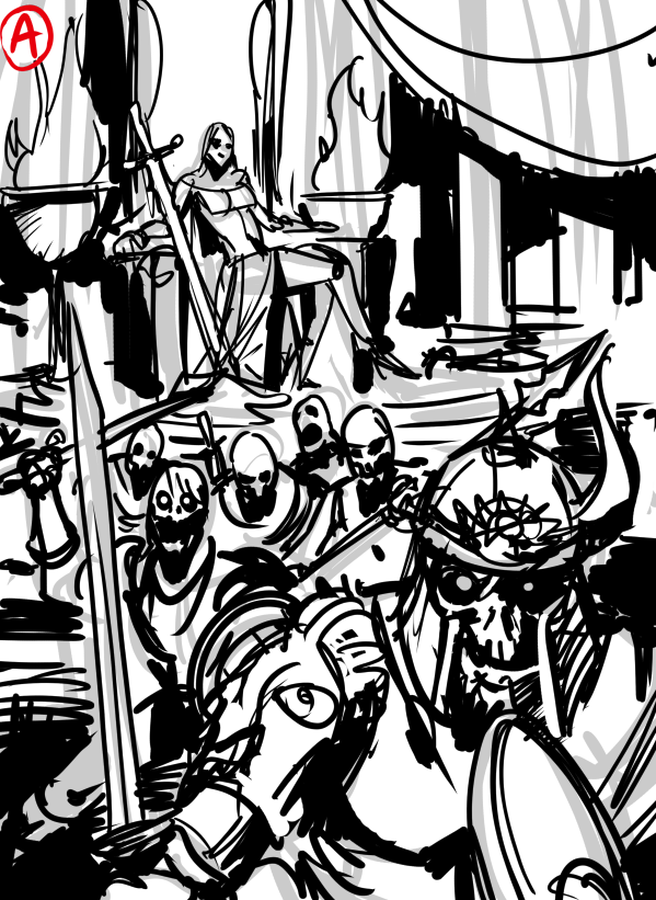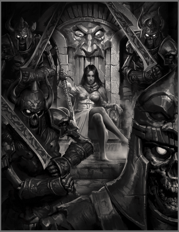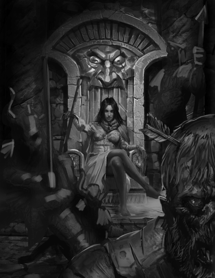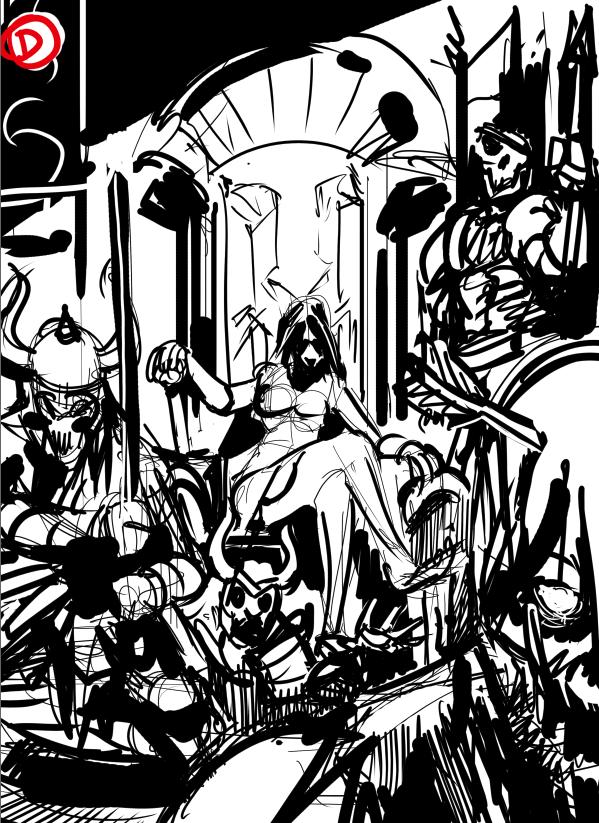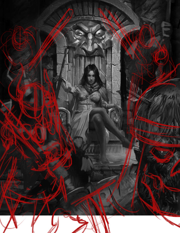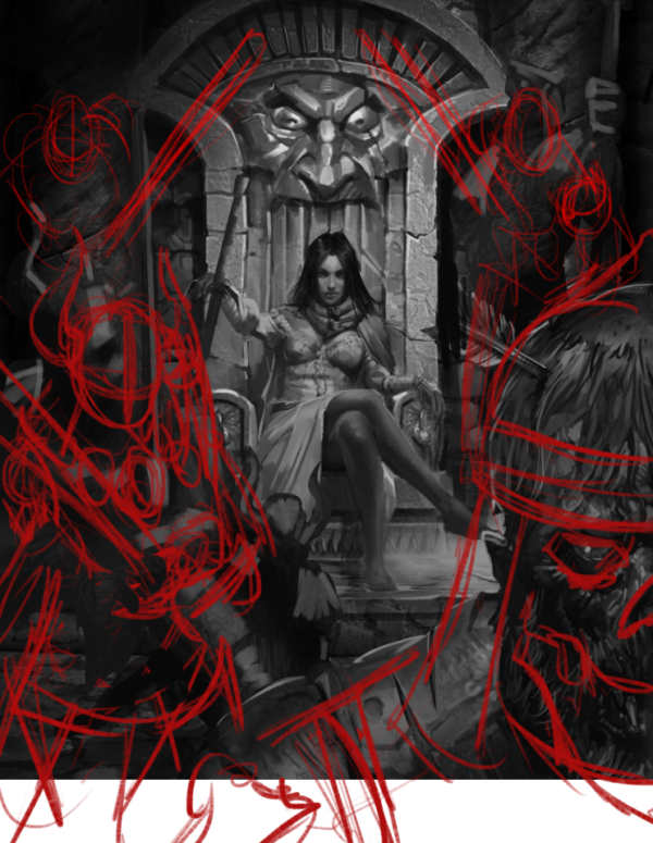 In this stage, Carlos started blocking in the Orgoth and Alexia. The overall vibe is there for Alexia, but the framing and scale of the Orgoth were off. I sketched directly over the art to add in a couple of Orgoth on either side of her and gave the foreground figures more prominence to help further frame her and make the scene feel a bit claustrophobic.