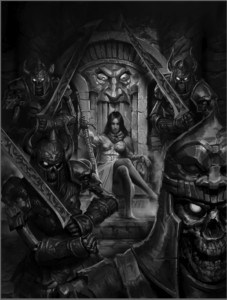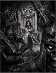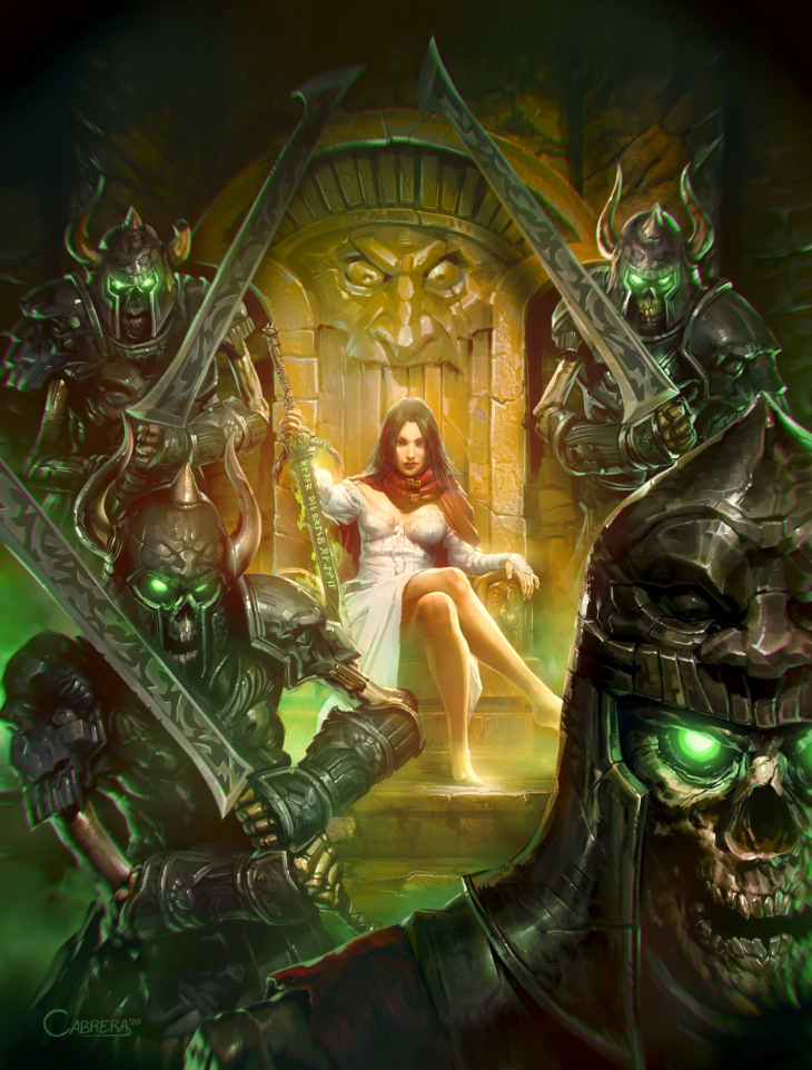 The throne is in an ancient Orgoth crypt, possibly illuminated by flaming braziers, lanterns, or torches, burning fire of an unnatural green color. The throne and walls, etc., should be adorned with Orgoth sculptures and design. Around her, beside her, before her, and behind her are undead. Some are ancient skeletons, risen from the grave. Others are freshly dead Nonokion Cultists (Infernal Cultists from Oblivion) that just perished at Alexia’s hands moments ago. There should be a variety of undead in various states, but all have flocked to her side and should appear ready to fight alongside her. The scene should make Alexia come across as super powerful and in total command of everything around her. It should be a scene that would be terrifying to look upon if you were just a measly first-level adventurer getting your feet wet for the first time.