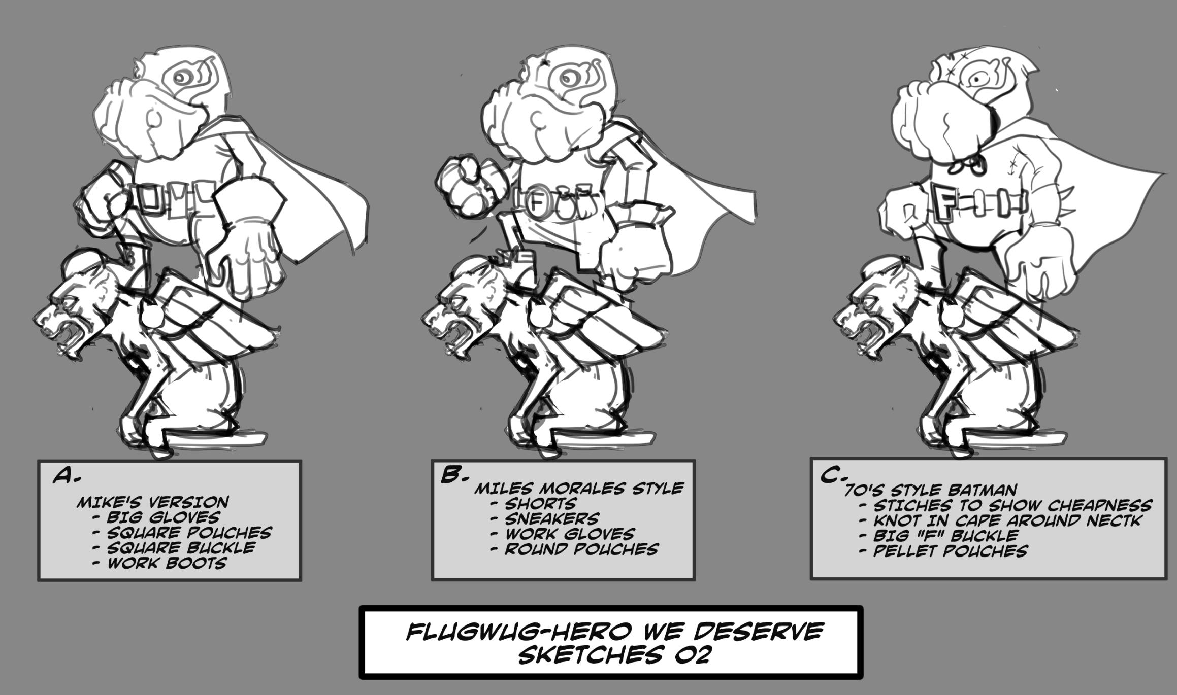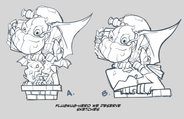 Hello, everybody! In this week’s Concept to ’Crate, I’m going to discuss the concept for Flugwug, “The Hero We Deserve.” This concept was fairly simple and straightforward in nature. Inspired by a brooding comic book hero with a large cape and who likes to hang out on top of buildings, this MiniCrate version of Flugwug is a fan of that character and has even made his own hero costume. For this task, I tapped Billy Dallas Patton, as I felt that with his comic book background, he was the perfect artist for the job.