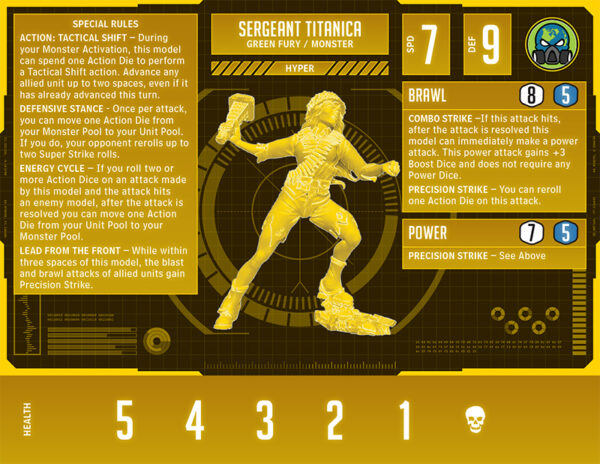 Defensive Stance is quite the mathy ability. But before anyone starts dusting off their high-school algebra books, I’ll give you a quick rundown on how this works. If Titanica has an Action Die available, her defense is statistically between 9 and 11. That number depends on which type of dice you ultimately end up choosing to reroll. If she is lucky enough to see two Super Strikes on Action Dice, it will make her defense, statistically speaking, closer to 11 than 9. On the other hand, rerolling two Power Dice tends to produce worse results for Titanica. Thus, if you encounter a wild Titanica, be sure to pay attention when choosing how many dice to roll.