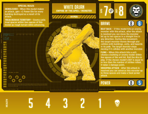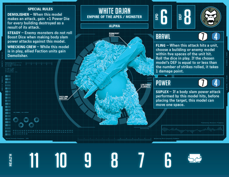 In hyper form, he gains a brand new ability, Sweeping Attack. After he performs his Demolishing Beat Back brawl attack, he can advance and make a swat. Since you can’t do it before the brawl attack, he won’t be able to clear units in the way of the target monster, but he might be able to clear the way for another of your other monsters. If you are desperate for Power Dice, you can brawl a monster, advance three spaces, and swat a unit into a building, netting you at least four Power Dice. One more thing to note is that Sweeping Attack does not use the word “immediately.” This means that once you make your brawl attack, you can do the swat or advance in any order or even step around in between the two.
