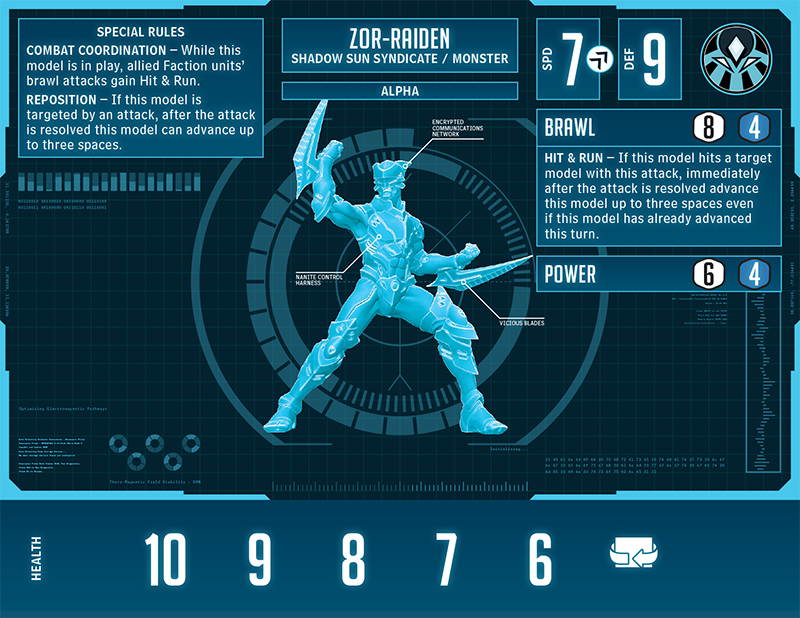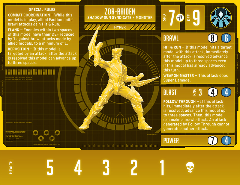In alpha, the only change is with Reposition. Yet unlike Titanica, he has it in both forms, making it a headache to pin Zor-Raiden down. Switching over to his hyper, you’ll see that this monster does one thing quite well: movement. You attack him, he moves; he attacks you, he moves. Follow Through on his blast in hyper lets him move ten spaces before making a Weapon Master brawl attack. After his notably accurate punch, he waltzes away another three spaces. A decidedly speedy monster.