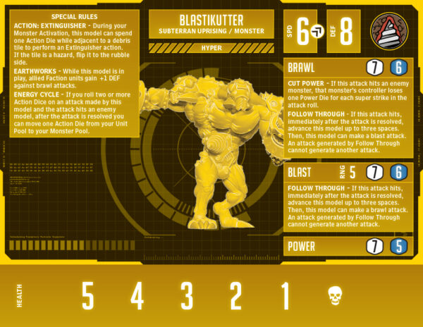 Further, Follow Through got a notable upgrade. In hyper, Blastikutter drops its focus on actions and becomes a dancer instead. Without spending any Action Dice on steps, Blastikutter can move 12 spaces! If I understand how numbers work (and I think I do), that’s the second largest number in the game. But, of course, we all know Gallamaxus cheats to be first by damaging himself to pull off his 14. And I very much doubt any monster will be beating that number, certainly not a certain Zor.