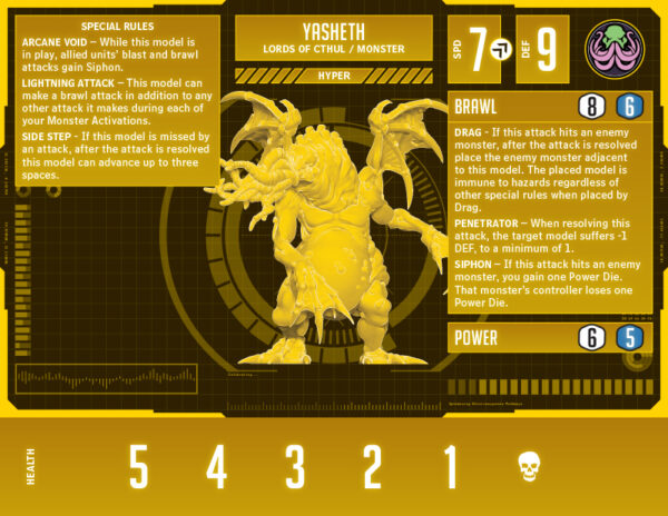 I suspect you thought since it got Arcane Void in alpha, it would lose it in hyper, didn’t you? Definitely not the case. Yasheth also has Side Step in hyper, where it had the better defensive stat anyway, so that just made sense. Its brawl in alpha gained a Boost Die, so in both alpha and hyper it is the most accurate brawl attack in the game. Finally, we added an interesting new rule, Drag. Drag lets you reposition a monster that Yasheth hits with a brawl attack. And Drag is an extremely powerful and unique ability; it can be used to pull enemy monsters out of a screen to set up a power attack. If you are really crafty, you can even Drag a monster twice in one turn using Lightning Attack. This will be extremely costly, both in Power Dice and Action Dice (as you’ll have to step at least a few times in between your attacks). It does permit you to move an enemy monster most of the way across the map, however, if you are willing to pay the price. Yasheth is a brawler through and through—instead of hitting hard, it uses those brawls to create advantageous situations throughout the entire game.