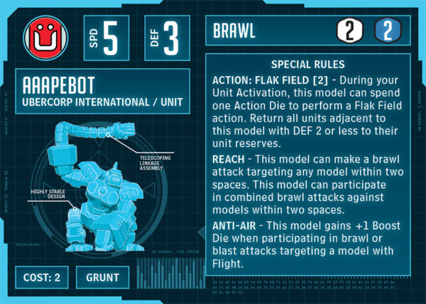 This poor robot has been somewhat left behind. We considered trying to make him 1 cost by altering some of what he does, but ultimately we couldn’t find a right balance while still getting him to do the same approximate things he did in the past. So instead, he just does everything he used to do but better; +1 SPD and an extra Boost Die on his brawl let him get out there and smash to his iron heart’s content. We also feared—wrongly, I should note—that Flak Field [2] was going to end up being too much. Through more playtesting, we determined it was just the right number.