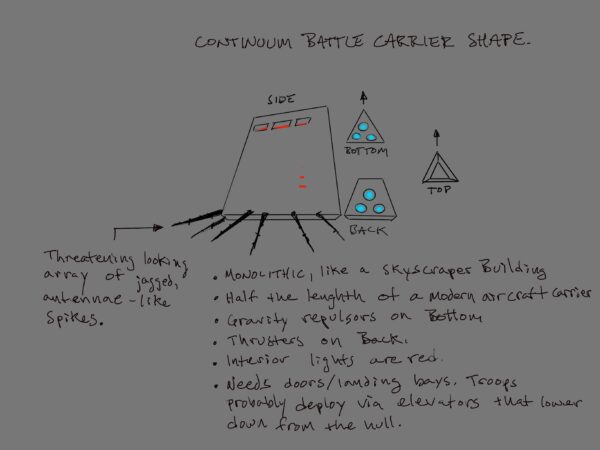 For the book we’re putting together now, there are several new scenes that present a more detailed looks at the setting than have been shown before. One example: the Battle Carrier schematics that Andrea Uderzo has worked up. We’ve previously seen these in separate illustrations done by Vincent Lefevre and the ISA carrier concept by Kevin Prangley. But the one in particular I was looking forward to seeing how it panned out was the Continuum Battle Carrier from the original rough sketch by Matt Wilson.