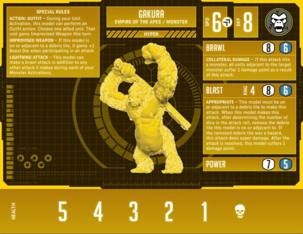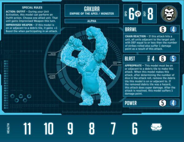 All that said, Improvised Weapon on a single model can often be utterly devastating. The obvious choice within Empire of the Apes is the Rocket Ape; however, Outfit doesn’t require that the model be within the Faction, so Draken Berserkers, Slashers, Bashers, and other models that can attack multiple times or attack multiple targets will really shine. Of course Gakura, the master of improvised weapons, has the rule for himself as well. Coupled with his considerable base Boost Dice, he can be extremely accurate. While swinging around with an Improvised Weapon, he has Chain Reaction, which lets him sweep away any who are unfortunate enough to still stand in front of him.