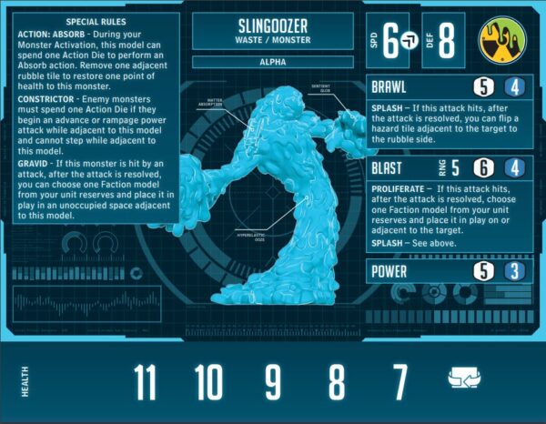 Action: Absorb showcases how this monster can take wreckage and turn it into more ooze so it can recuperate; however, this action can only consume rubble tiles. Of course, Slingoozer has a plan to sidestep that restriction. Splash allows you to flip hazards when you attack something near them. Although the requirement on Splash states adjacent, it is important to remember that a unit on a hazard is also always adjacent to it (because the hazard is bigger than the unit). Further, both Proliferate and Splash trigger and resolve at the same time, so as the attacking player, you get to choose which order they resolve in. Thus, if you shoot a unit in a hazard, you can flip the hazard to the rubble side before placing the new unit from Proliferate.