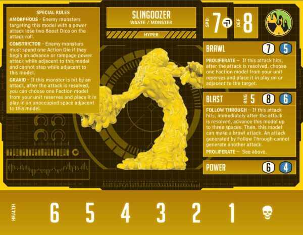 In hyper, Slingoozer forgoes playing with rubble tiles and focuses on more proliferation and defense. Between Constrictor consuming resources or making it difficult to get into position around Slingoozer and Amorphous reducing the effectiveness of power attacks, this waste monster can survive alongside the best of ’em.