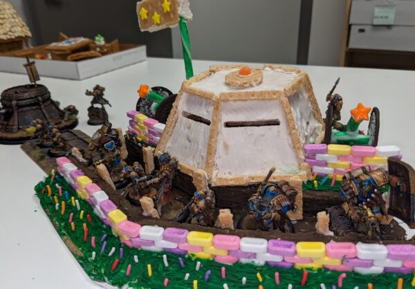 But these are not any old ordinary houses crafted from confectionary, of course. Our staff’s creations are aiming to feel at home in the world of the Iron Kingdoms. Be they humble Giving Day House treats or locations warped by the twisted magic of the Grymkin, we let our team’s imaginations take hold, and we were not disappointed. In fact, we’re having trouble picking our favorite one. So, that’s where you come in!