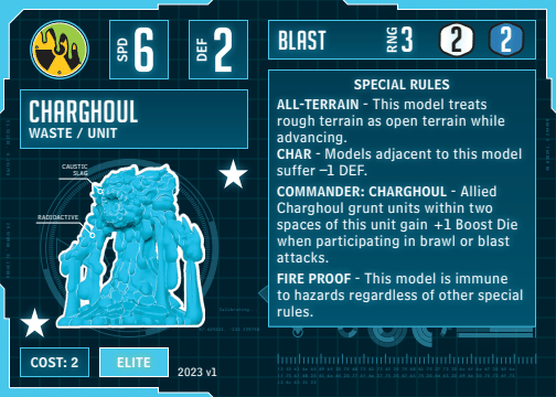 In this Waste unit pack, the Miasmist weighs in as both the assassin of the Faction and the Faction’s switchblade tech piece. At SPD 7, DEF 3, with Flight, High Mobility, and an excellent RNG 4 blast attack, this unit is worth its cost 2. On its 2/2 blast attack it’s also packing Energy Sap for those games when you want to really harass your opponent’s resources or that important moment when you need to shift tempo back in your favor. Since it may be hanging out harassing monsters, the Miasmist also has Drain Life, which prevents enemy monsters from restoring health while adjacent to the unit. As if that weren’t enough, these noxious rolling nimbus packs have a built-in Countermeasure. Each enemy unit within two spaces of the Miasmist can’t have its stats increased higher than the numbers printed on its card. Collectively, this stacks up into quite the denial harrier. When combined with the Charghoul, these units can add some sickening fun to your most toxic lists.