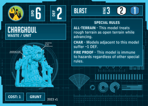 This unit is a gurgling font of radioactive slag. Hotter than white phosphorus, this molten puddle of metal is Fire Proof, granting the Faction (looking at you, Slingooze) a unit that can stand on a hazard. Everything—and I mean EVERYTHING—the Charghoul touches instantly becomes scorched. This Ghoul’s Char ability (see what I did there) is a static –1 DEF to every model adjacent to it—friendly, enemy, or otherwise. Think very carefully before screening your monster with a Charghoul. This unit definitely does not belong securing your power base.