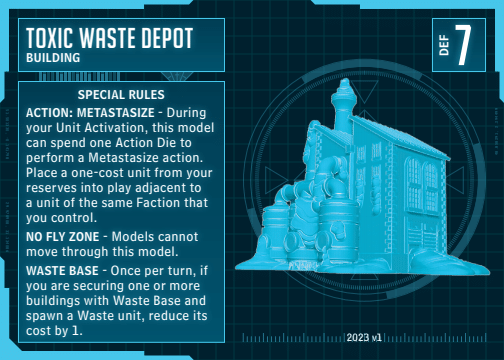 I promised that there would be a building, and I’m here to make good on that promise. The Toxic Waste Depot has two key rules to bear in mind. First is its Action: Metastasize. This action allows you to place a 1-cost unit from your reserves adjacent to a unit from the same Faction that you control. You can only activate this ability on your unit turn, but it can allow you to use your own units as a spawn point for other Faction units. To deepen the lines of denial within the Waste Faction, we also added the rule No Fly Zone, which prevents models from moving through it. (This does not prevent rampages that smash through the building.) And the cherry on top of this disgusting pile of sludge is that with more Waste units, the Waste base discount will be that much better.