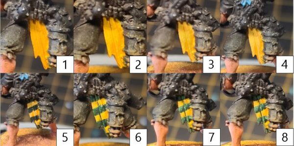 - Step 7) Finally, to finish of this area, add a drop of Menoth White Highlight to the previous mix and apply this mix as a final hard line to define the green areas.