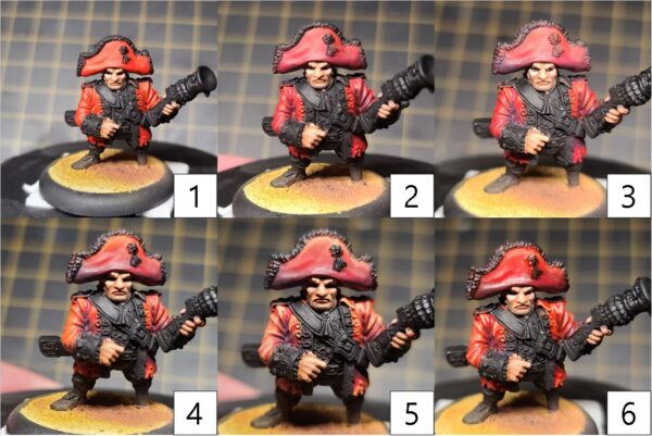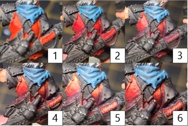 - Step 6) Time to make a glaze and shift all the colors to a deep red tone. Take Red Ink and add water in a 1:14 ratio. This extremely thinned-out ink is the final step. Apply this color evenly across the model in a thin layer, making sure it doesn’t pool up anywhere. This technique is known as glazing. In short, we are shifting the colors on the model to a more saturated red tone. To get this, apply about 12–15 layers of glaze, making sure that each layer completely dries before moving on to the next. Pro tip: Using a hair dryer on low and from a distance can speed this step up. But don’t rush this, as if it doesn’t dry completely before moving on to the next layer, it is possible to damage the previous layer of glaze. While a bit time consuming, the results will speak for themselves.