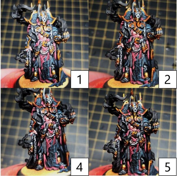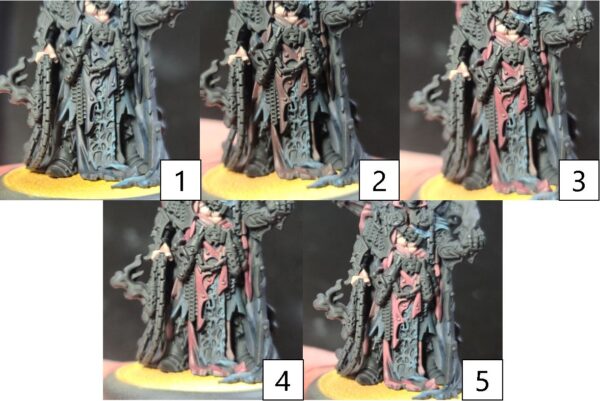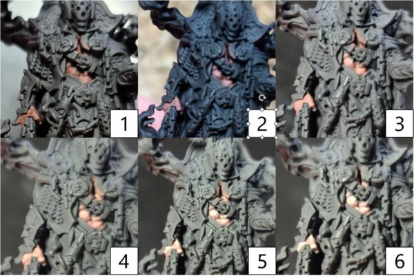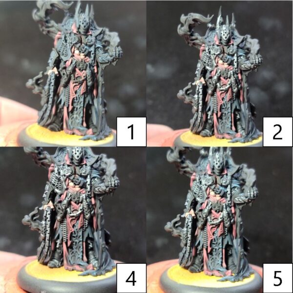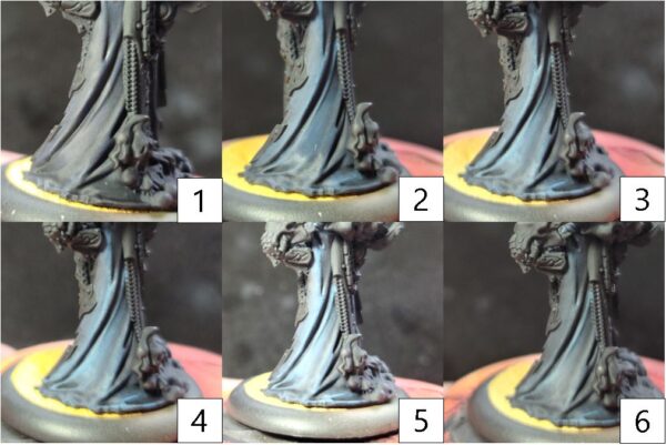 Step 6) Once the previous step has completely dried, it’s time to bring all of it together with a few layers of glaze to get the tone we’re looking for. Mix Armor Wash with water and Mixing Medium. Using this mixture, apply even coatings across the black cloth. Make sure to not let this mixture build up into the recesses. Use thin coatings to build up, then dry, and then reapply to get the look we want. On this model, I laid down 11 layers. Pro-Tip: A hair dryer on low will greatly speed up this step.