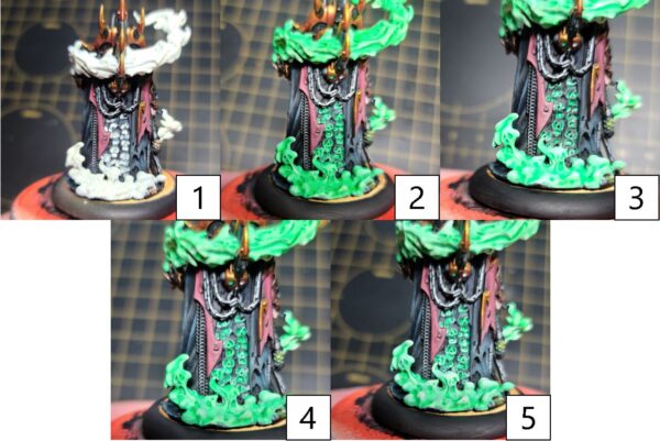 Step 5) Finally, for the most raised and highest edges, mix a small amount of Menoth White Base and Mixing Medium to create smooth glinting highlights on the black cloth.