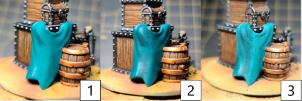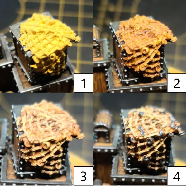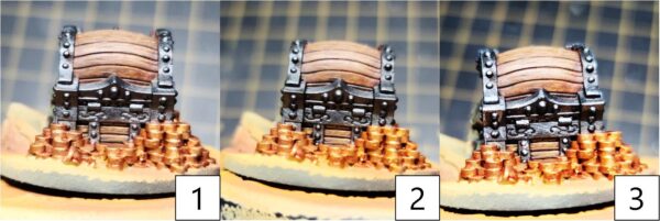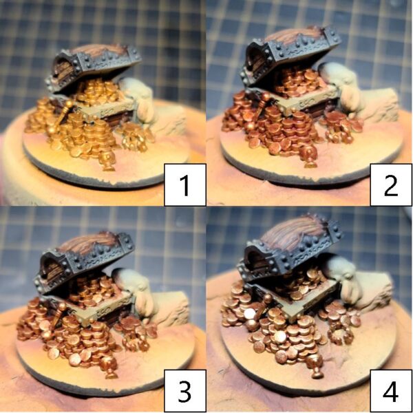 Step 1) It’s time to fill the treasure chests and the rest of the model with the golds. I start with a solid basecoat of Rhulic Gold.