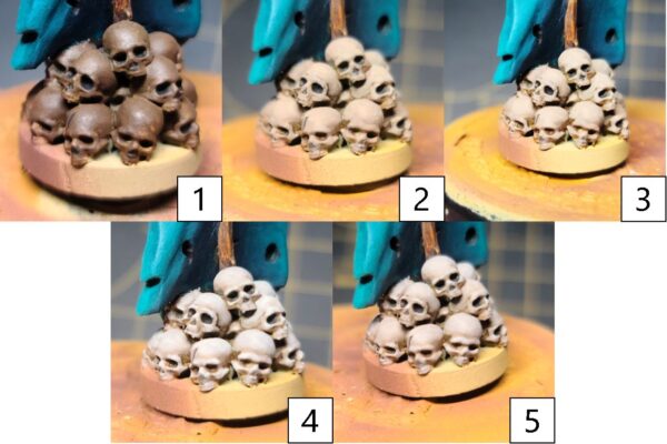 Step 1) Next up: all of the various skulls. Start by mixing Battlefield Brown and Bootstrap Leather together and applying this as a basecoat.