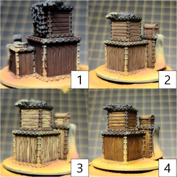 Step 1) With the basing complete, it’s time to tackle all of the wood on the various objectives. Previous Insiders have shown a seven-step process that makes a very rich vibrant wood, but with time short, let’s see if we can cut a few steps out and still get something that looks great. Start with a basecoat of Battlefield Brown.