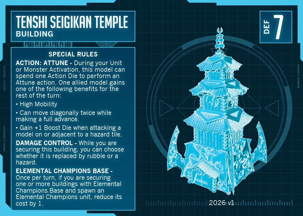 The Tenshi Seigikan Temple comes with the standard “Faction building” rules: like most Faction buildings, it clocks in at a respectable DEF 7 and the associated Faction Base rule provides a discount when spawning Elemental Champions units.