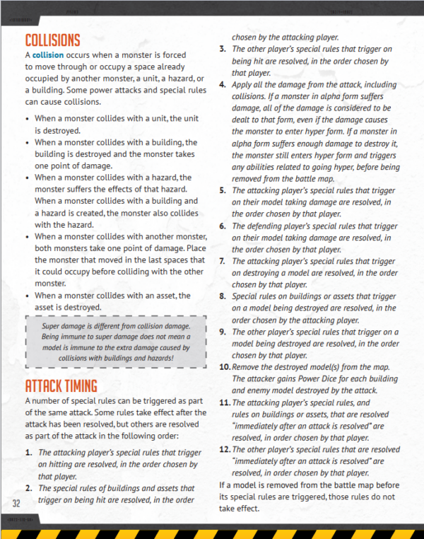 - Monsters are placed by power attacks in Timing Step 1 and suffer collision damage in Timing Step 4, but destroyed models aren’t removed from the board until Step 10. How does that work?
